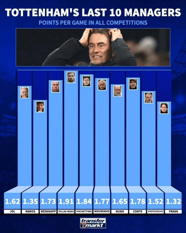 北京时间1月11日消息,德国转会市场统计了近10任热刺主教练在各项赛事的场均积分,现任主帅弗兰克最低,场均积分只有1.32分。